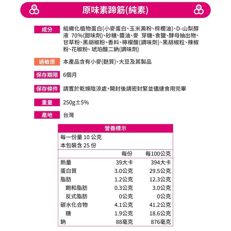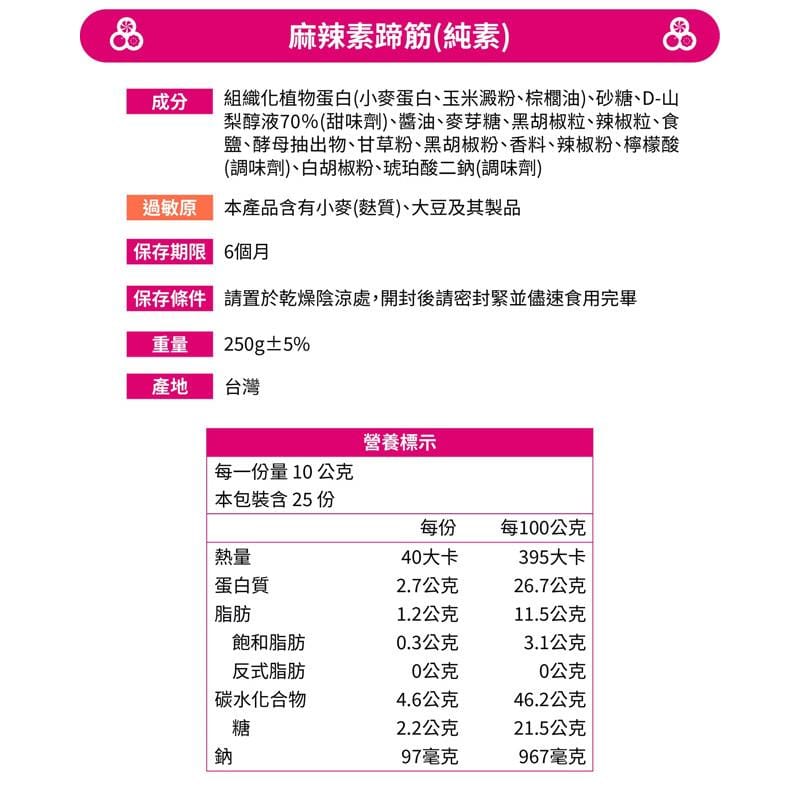Ingredients: Textured Vegetable Protein (Wheat Gluten, Corn Starch, Palm Oil), Sorbitol Solution 70% (Sweetener), Sugar, Soy Sauce, Maltose, Salt, Yeast Extract, Licorice Powder, Ground Black Pepper, Spices, Citric Acid (Seasoning), Black Peppercorns, Chili Powder, Sichuan Pepper Powder, Disodium Succinate (Seasoning).